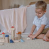 Περιέχει 30 κομμάτια σε 10 διαφορετικά σχήματα, από αυτά τα 12 είναι χρωματιστά και τα 18 σε φυσικό χρώμα ξύλου.